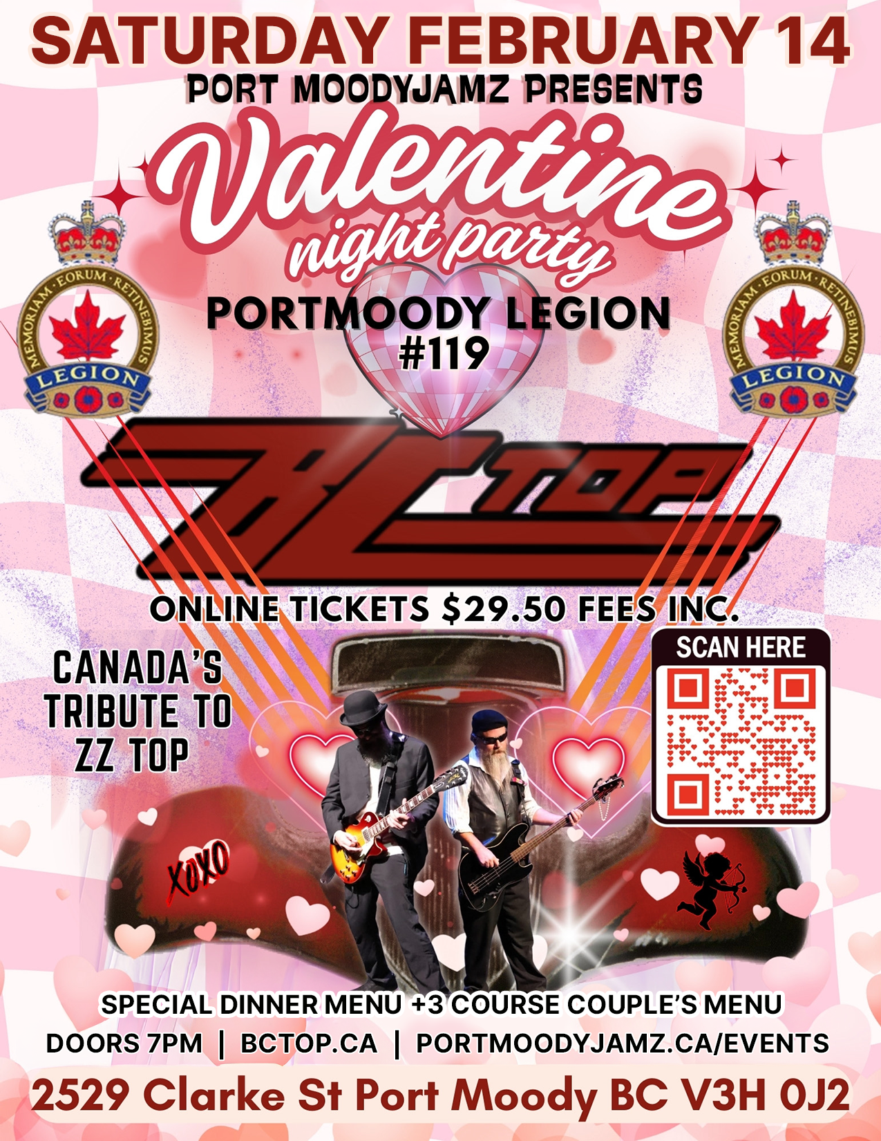 This evening promises a Valentine’s Day to remember. BC top Gives a high energy show while faithfully performing the music of ZZ Top. Red seal chef Michael Turner is creating a fantastic menu for the evening. Bring that special someone out for an evening of great food, music and dance.